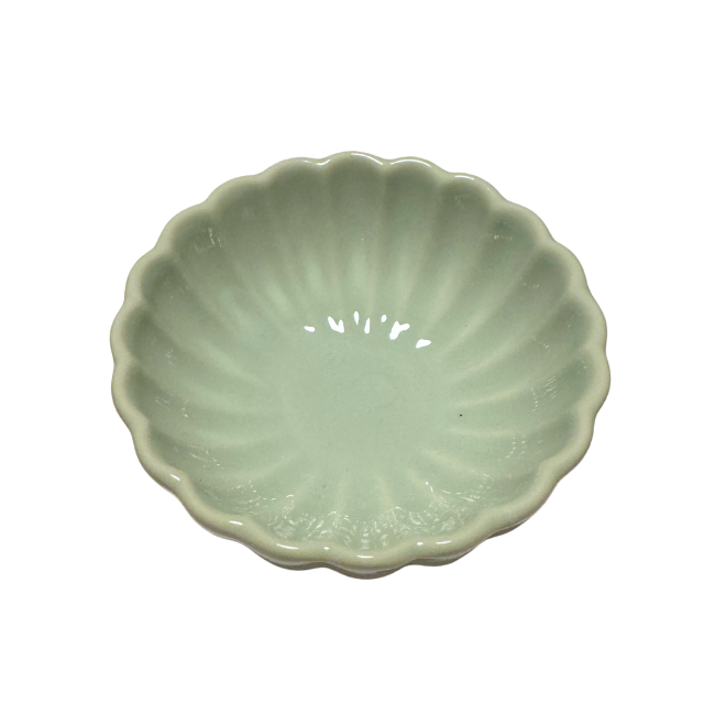 This charming small dish features a soft hiwa (light yellow-green) glaze paired with a gentle chrysanthemum shape.
