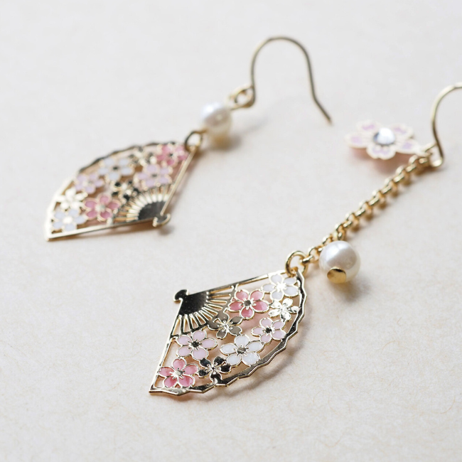 Disse elegante øredobbene kombinerer populære japanske motiver – vifte og kirsebærblomst – i et delikat design.